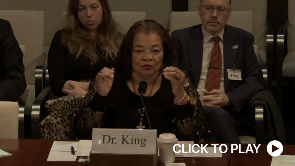 Dr. Alveda King: “Thank you, Madam Chairwoman. As a point of privilege, let me first, thank you for making it easier for people to access and that number, that the file number, where we can get the information. We really appreciate that. Also, I wanted to mention an individual’s humanity does not diminish their impact on the world because I’ve heard little subtle thoughts about that. But as human beings, we want the world to be a better place. Also, the King family really appreciated the 45th Administration and now the 47th Administration in focusing on what really happened without all of the other issues and things that people want to hear, the salacious things. We are very grateful for the way that this administration is handling that…But I think transparency and truth are so important. You know, this is a time when our nation feels deeply divided, and this moment offers an invitation to unity, to prayer, renewed commitment to those ideals that bind us together.”